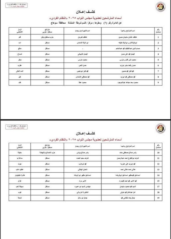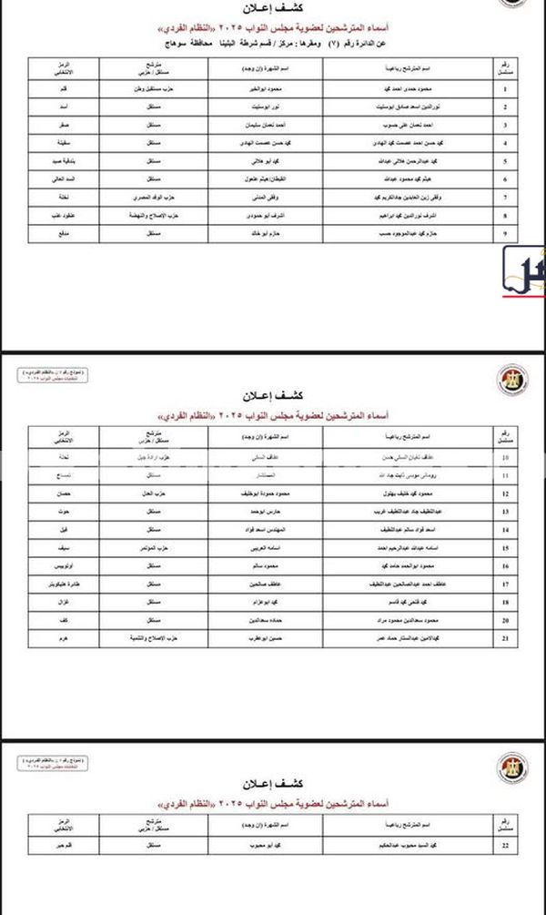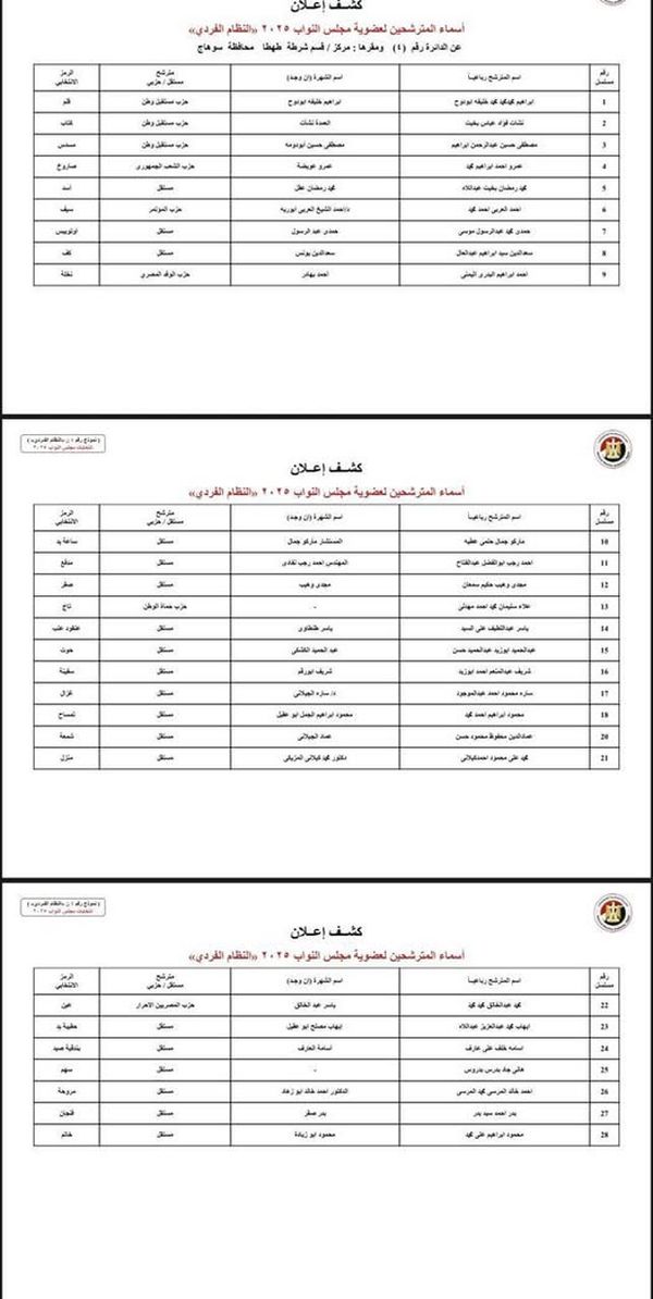 جدير بالذكر تقدم في محافظة سوهاج 187 مرشحا لخوض انتخابات مجلس النواب 2025، بـ 8 دوائر انتخابية، وكانت اللجنة المختصة بتلقي أوراق الترشح بقيادة المستشار عبد الناصر تايب رئيس محكمة سوهاج الابتدائية ورئيس الاستئناف، وعضوية المستشار هيمن سامي نائب رئيس المحكمة، والمستشار يوسف الصاوي مدير إدارة التنفيذ ومساعد رئيس اللجنة، فتحت أبوابها من الأربعاء قبل الماضي وحتى الخميس الثانية ظهرا.